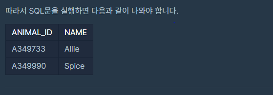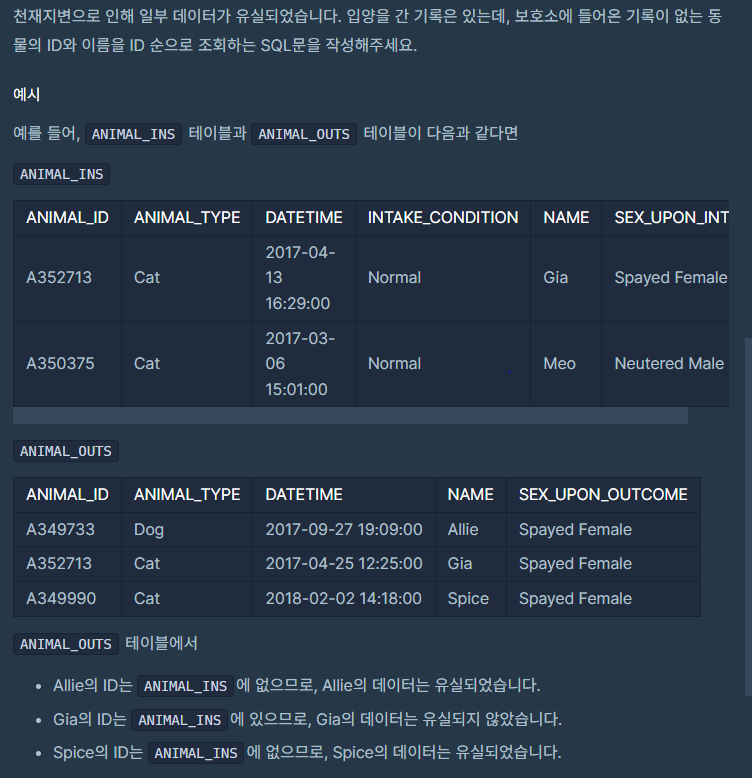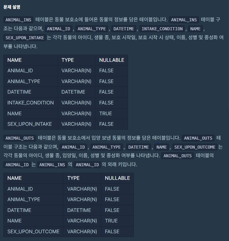 ANIMAL_INS 테이블은 동물 보호소에 들어온 동물의 정보를 담은 테이블입니다. ANIMAL_INS 테이블 구조는 다음과 같으며, ANIMAL_ID, ANIMAL_TYPE, DATETIME, INTAKE_CONDITION, NAME, SEX_UPON_INTAKE는 각각 동물의 아이디